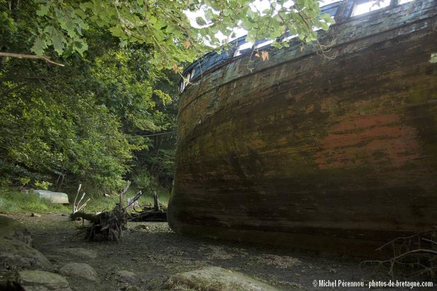 Hélas ces lieux autrefois appelés cimetières marins, vont devenir de plus en plus rares, comme l'anse de Saint Laurent qui a été débarrassée de ses vieilles carcasses au mois de juin 2012, sous couvert de sécurité et/ou d'écologie. C'est ainsi qu'une pelleteuse est venue détruire ce qui restait de la carcasse du ND de Penhors, (et non de l'An Dri Lam comme je l'avais mentionné par erreur) |