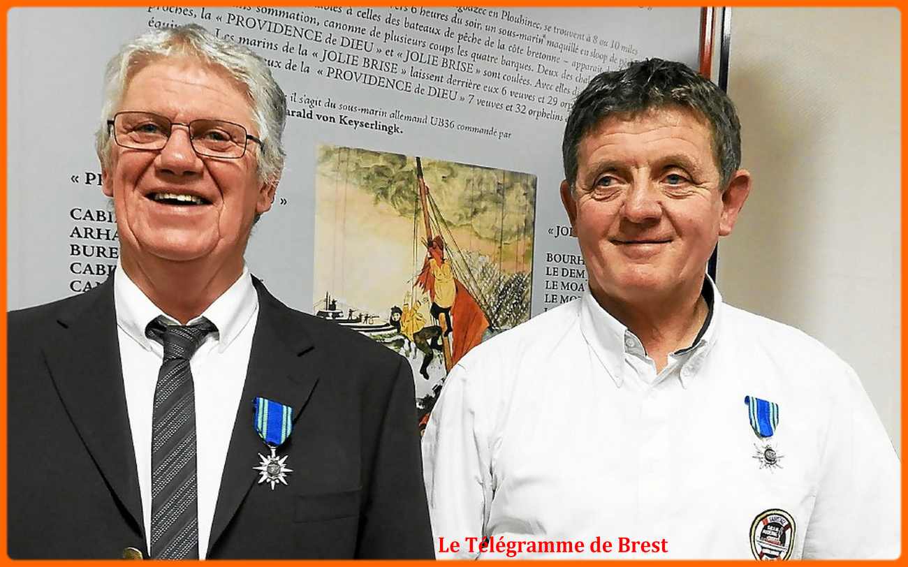 Dominique Lapart (à g) patron de l'Amiral Amann et Jacques Griffon (à D) patron de la Jeanne Pierre II à l'issue de leur décoration de la médaille du mérite maritime | |||