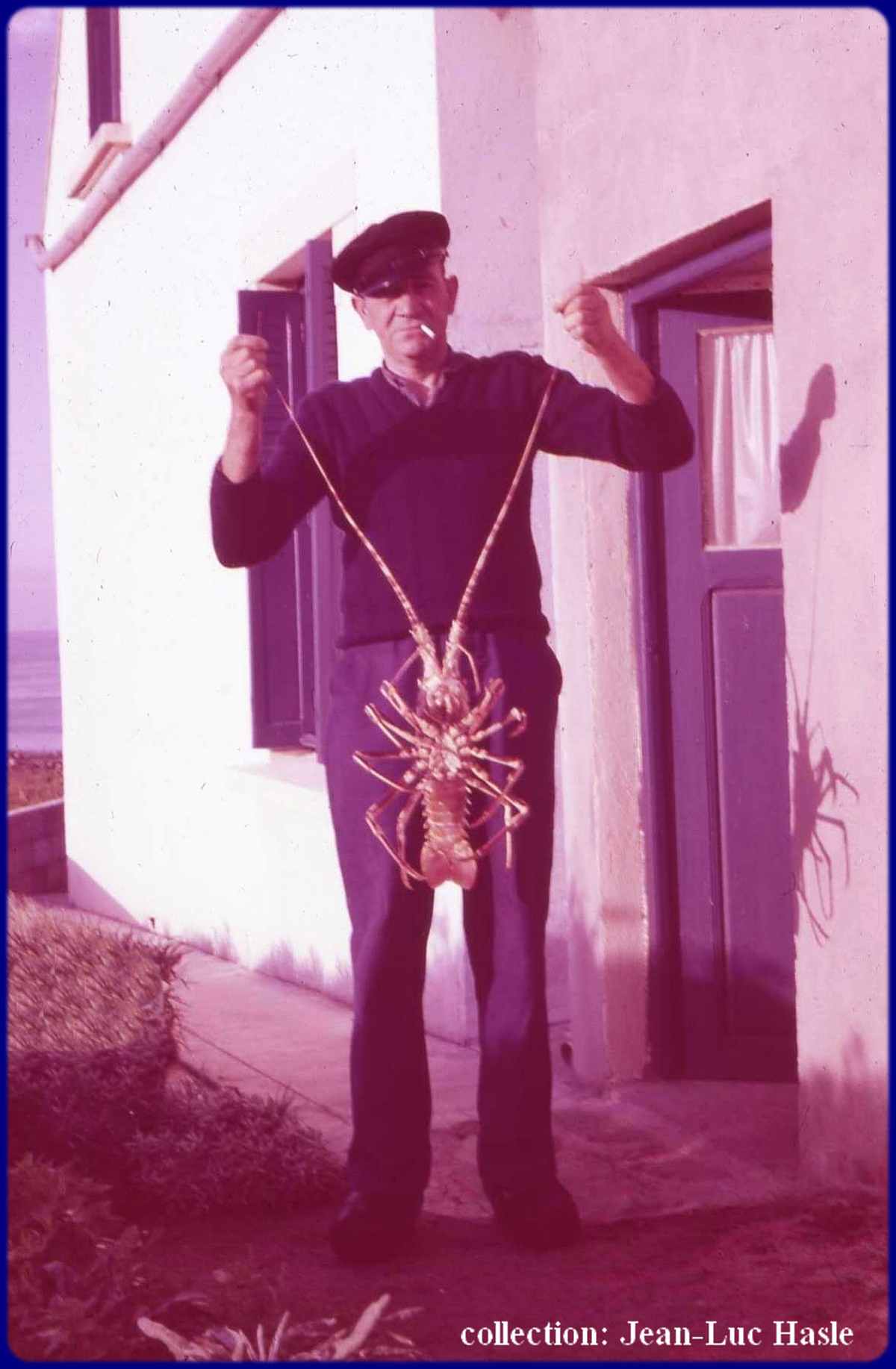 Laurent Salaun, grand-père de Jean-Luc Hasle montrant fièrement une belle langouste | ||