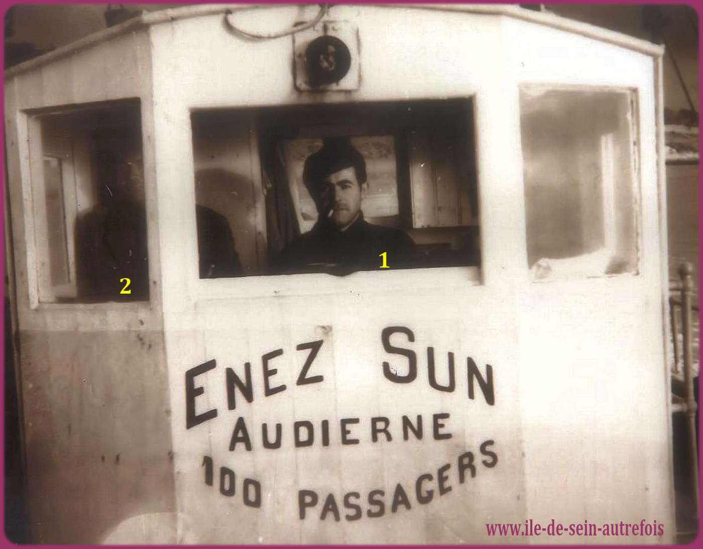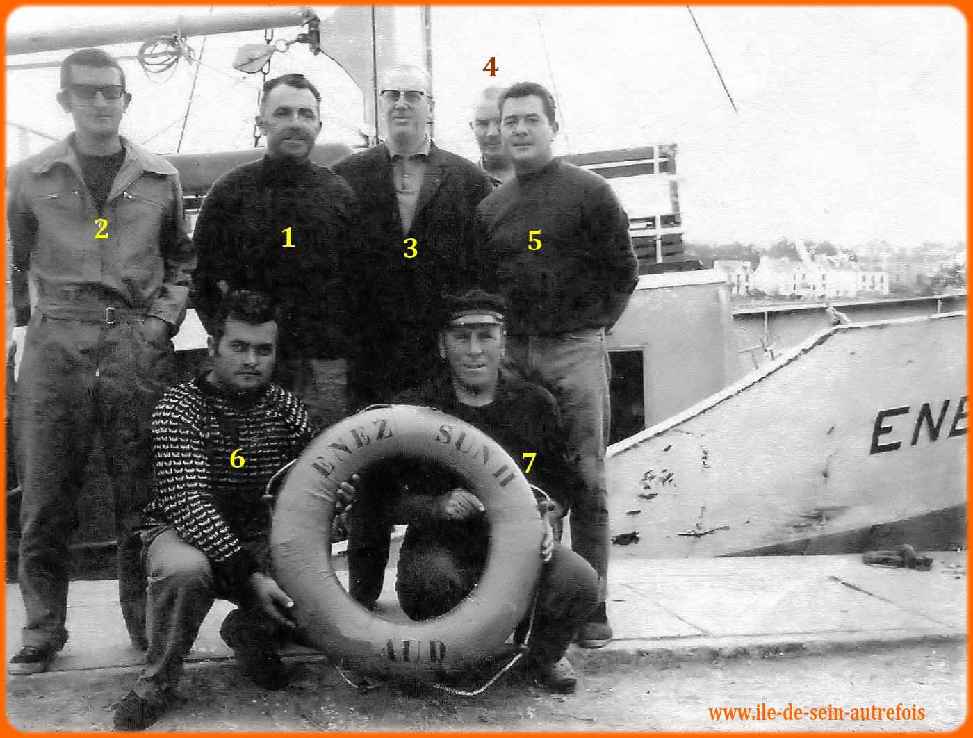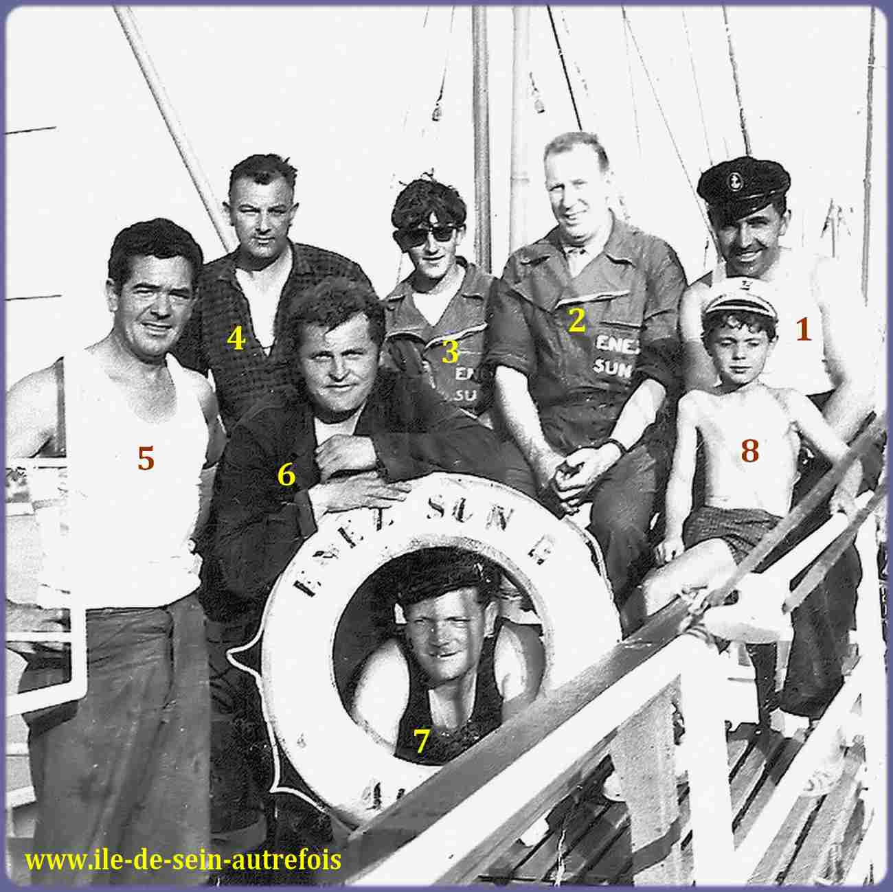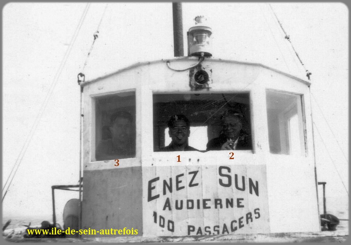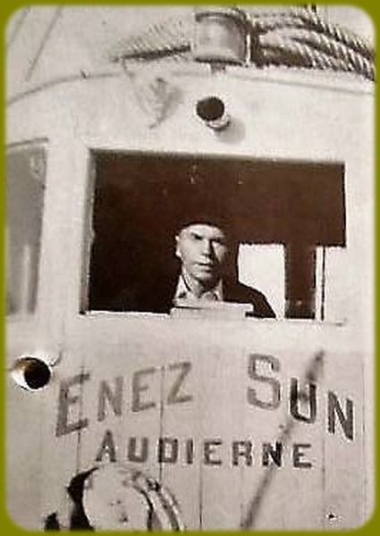 | Vincent Fouquet avait débuté sa carrière en janvier 1950 sur l'Enez Sun gris en tant que matelot, il en deviendra le patron en 1953 jusqu'en 1958. En 1962 il succèdera à Jos Guilcher à la barre du tout nouveau Enez Sun II, l'Enez Sun en fer. C'est tout naturellement qu'au remplacement de Enez Sun II par l'Enez Sun en bois que Vincent assurera avec un grand professionnalisme le commandement de ce nouveau courrier qu'il quittera en 1982 pour prendre une retraite bien méritée après 32 ans de dévouement au service de ses compatriotes et aussi de ces nombreux anonymes qui, dès les beaux jours embarquaient à la découverte de l'île. Il est parti en 2010 pour une ultime traversée en laissant le souvenir d'un grand marin dévoué au service public. |