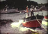 Ambiance de fête ce jour de 1974 aux chantiers navals de la rive gauche du Goyen : lancements de "Malgré tout" et "Perle des Vagues" chez Quillivic, et "Sant Rumon" chez Tanguy ( en arrière plan ) |