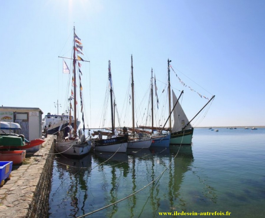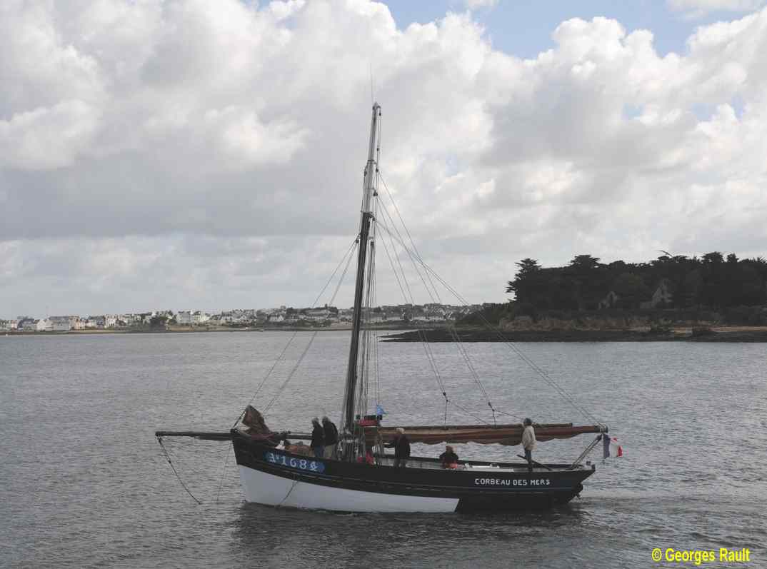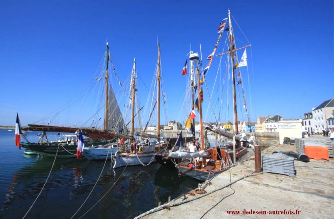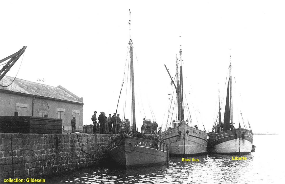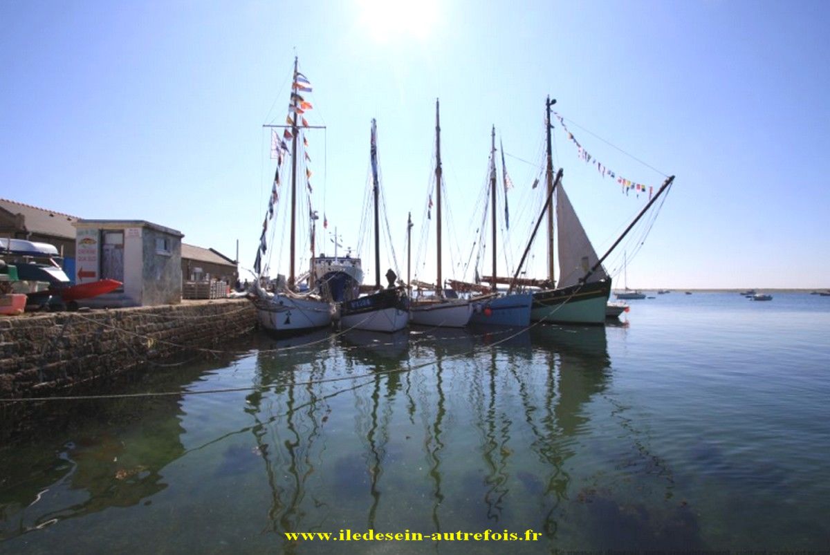 "Corbeau des Mers" que l'on voit ici dans le port de Sein, devant "Enez Sun I" & "Liberté" avait repris ses activités de caseyeur dans le Raz de Sein, il sera même pratiquement le dernier sloup en activité du quartier d'Audierne à la fin des années 60, il partira ensuite draguer la coquille au quartier de Brest ( BR 7215 ) pendant quelques années.