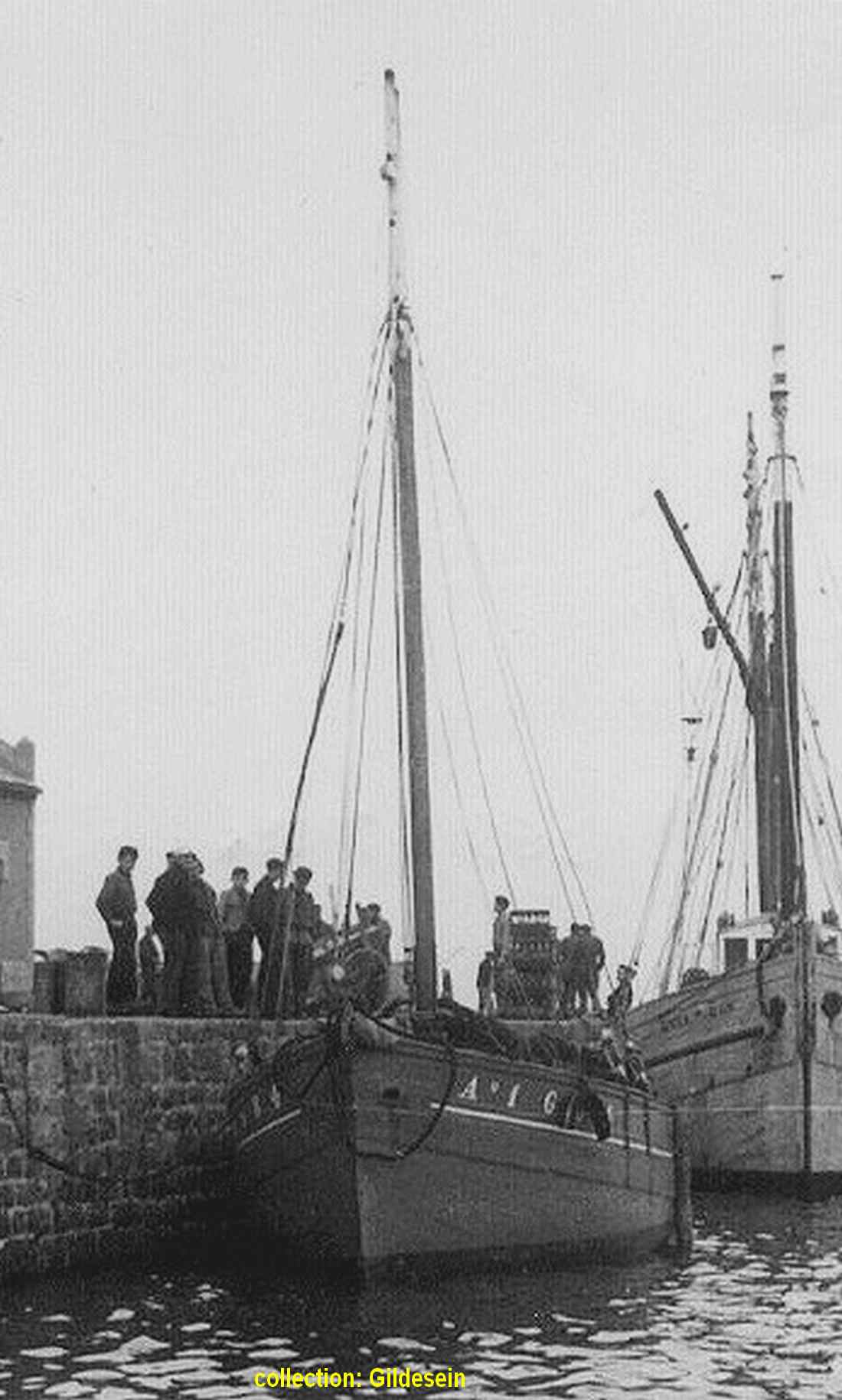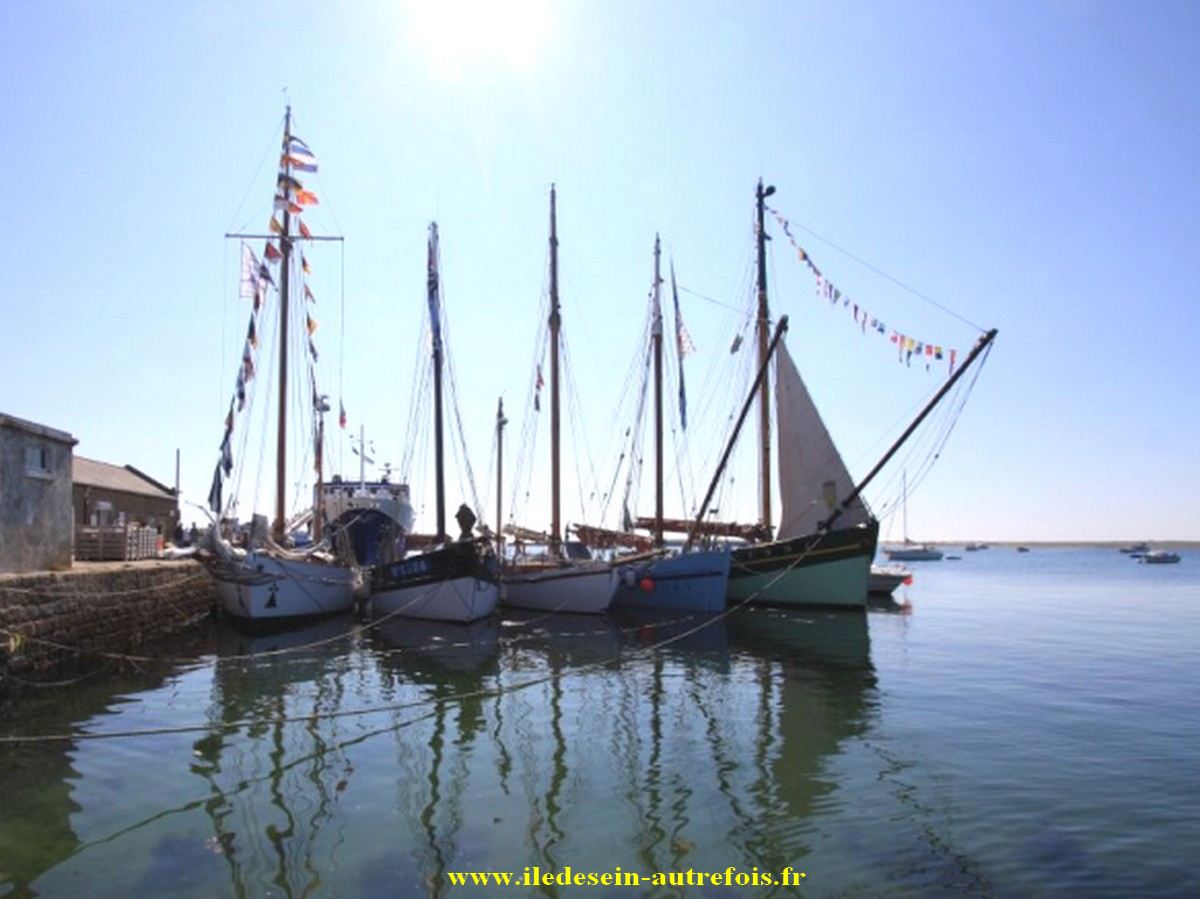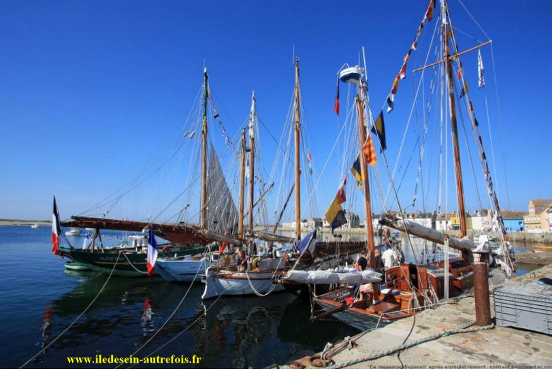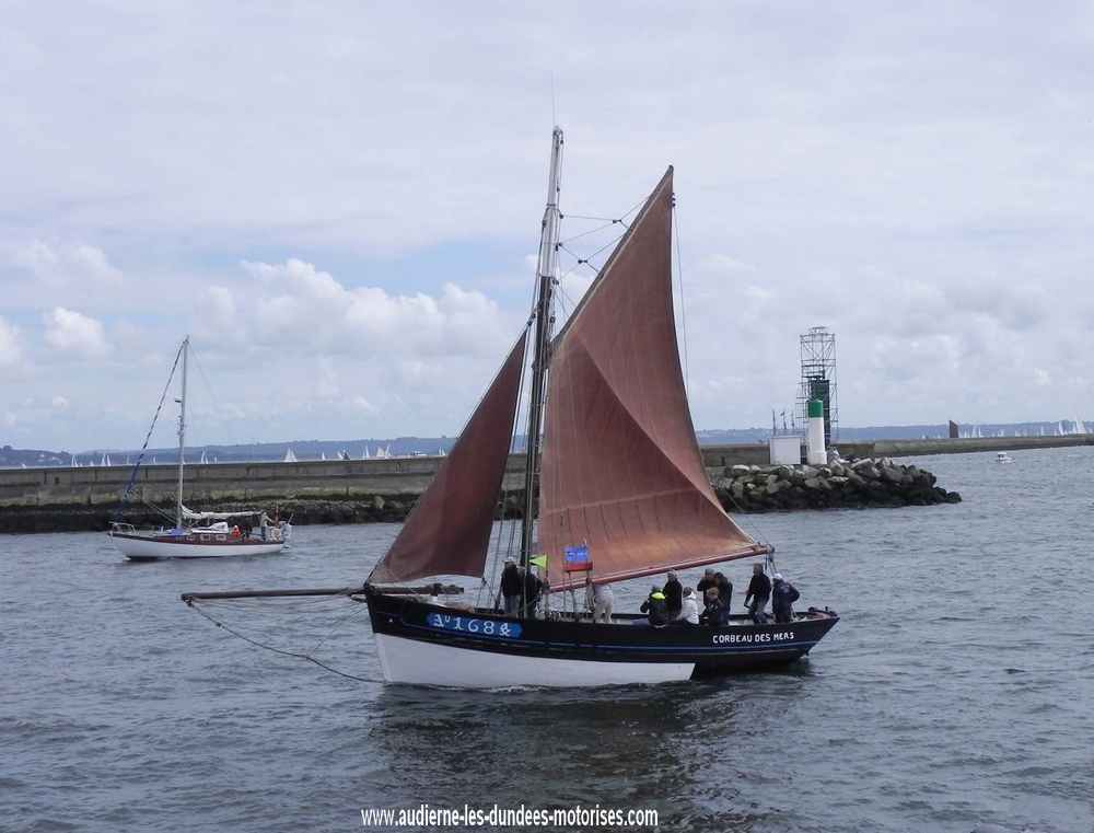 "Corbeau des Mers" que l'on voit ici dans le port de Sein, devant "Enez Sun I" & "Liberté" avait repris ses activités de caseyeur dans le Raz de Sein, il sera même pratiquement le dernier sloup en activité du quartier d'Audierne à la fin des années 60, il partira ensuite draguer la coquille au quartier de Brest ( BR 7215 ) pendant quelques années.