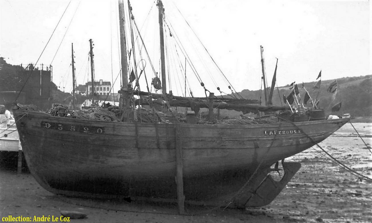 | Le 17 avril 1942, ses deux propriétaires inscrivent "Lapérouse" au quartier de Douarnenez (D 3520), où il va être exploité pendant 26 ans. Le 2 octobre 1943 "Lapérouse", avec Germain Pouchous comme patron, connut son heure de gloire en appareillant de Tréboul au nez et à la barbe des allemands emmenant vers l'Angleterre une vingtaine d'hommes qui rejoignaient le général De Gaulle. Une plaque commémorative érigée sur le port de Tréboul nous rappelle cette spectaculaire et courageuse évasion. |