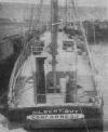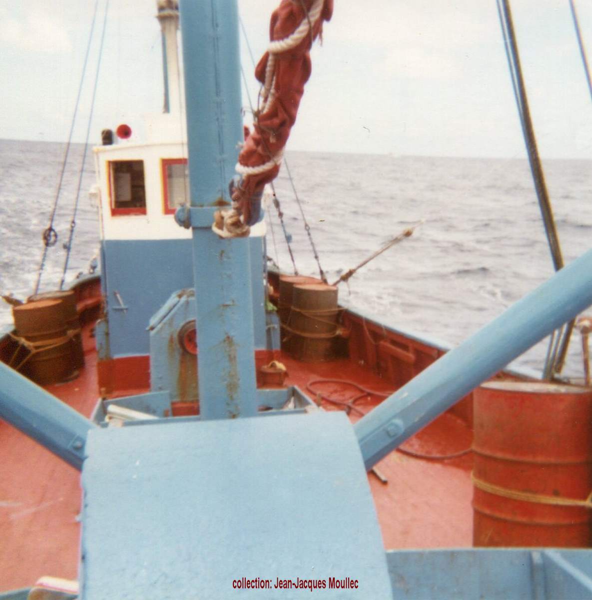 | à remarquer les nombreux fûts de gas oil de réserve, solidement amarrés sur le pont |