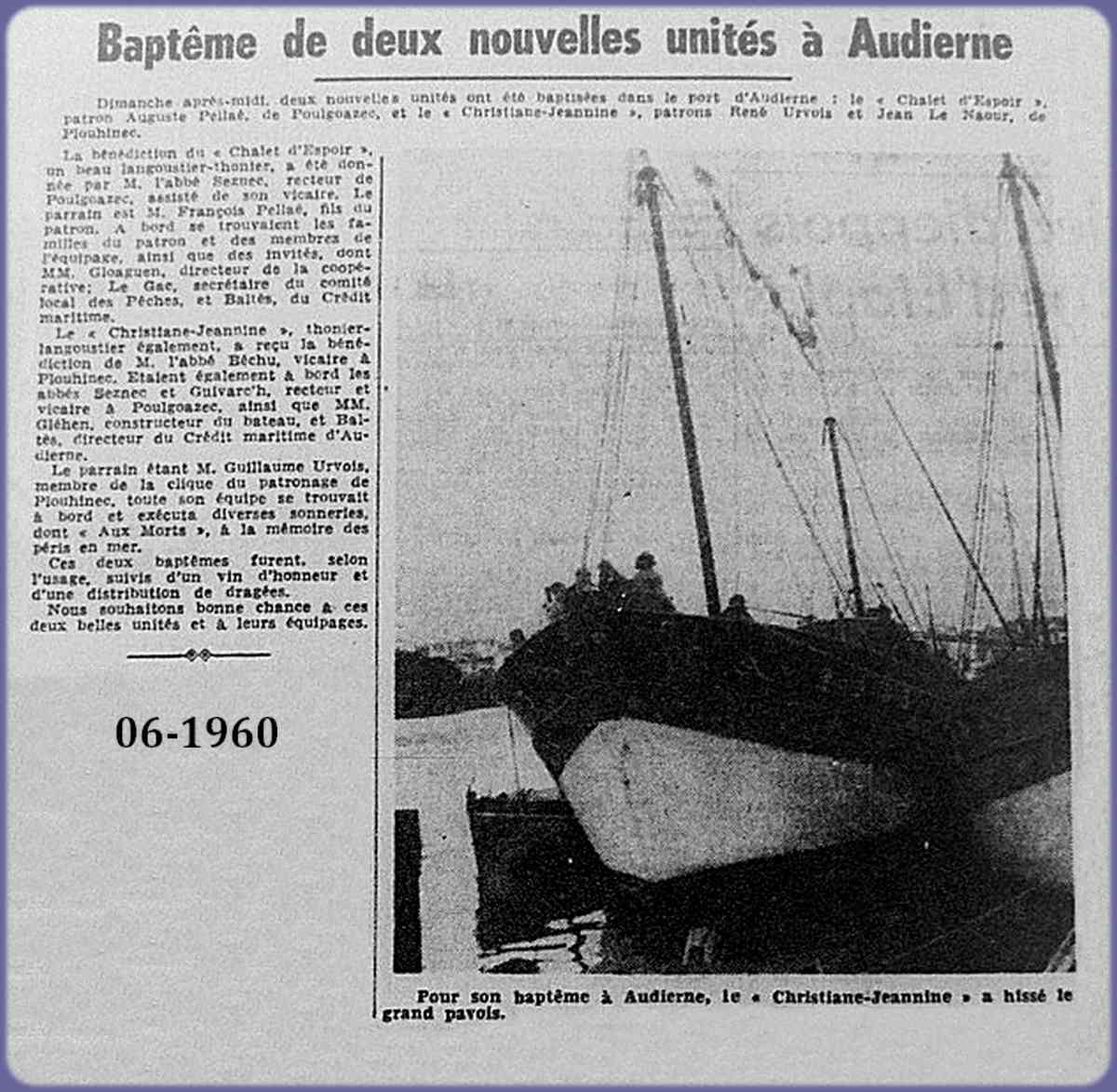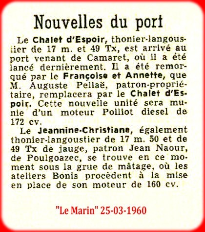 "Jeannine Christiane", racheté en 1973 par Jean Jacques Tanguy et Gaby Béganton , a essentiellement pratiqué ensuite la pêche aux tourteaux en Manche à partir de Moguériec.