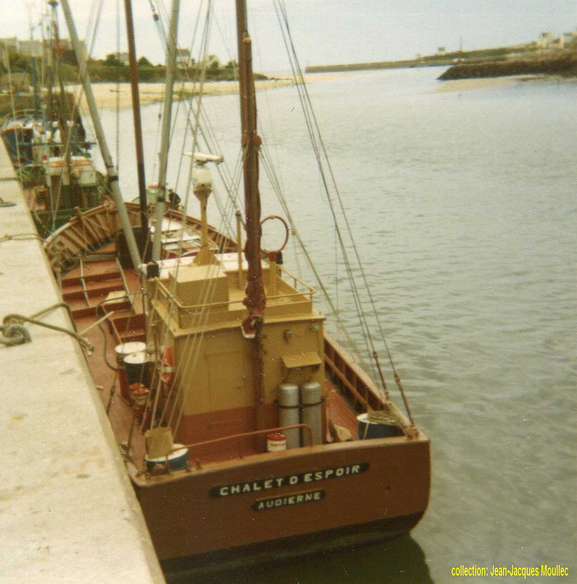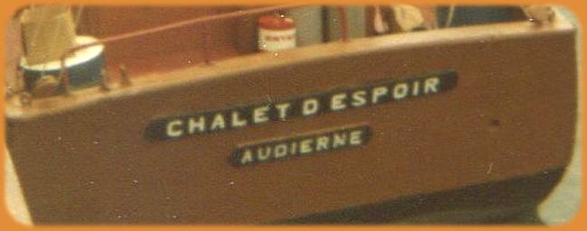La particularité de "Chalet d'Espoir" résidait d'abord dans la poésie de son nom et aussi dans les deux tons bruns de sa coque, couleurs qu'il avait reprises à son prédécesseur "Françoise Annette", ce qui en faisait un bateau très attachant. |
