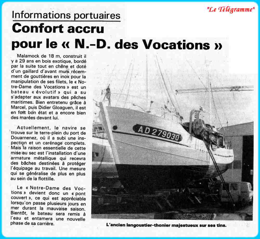 Tout au long de sa longue carrière, ND des Vocations a pratiqué différentes pêches, tour à tour langoustier, thonier à tangons, fileyeur, il a aussi subi différentes transformations pour l'adapter à ces différents métiers