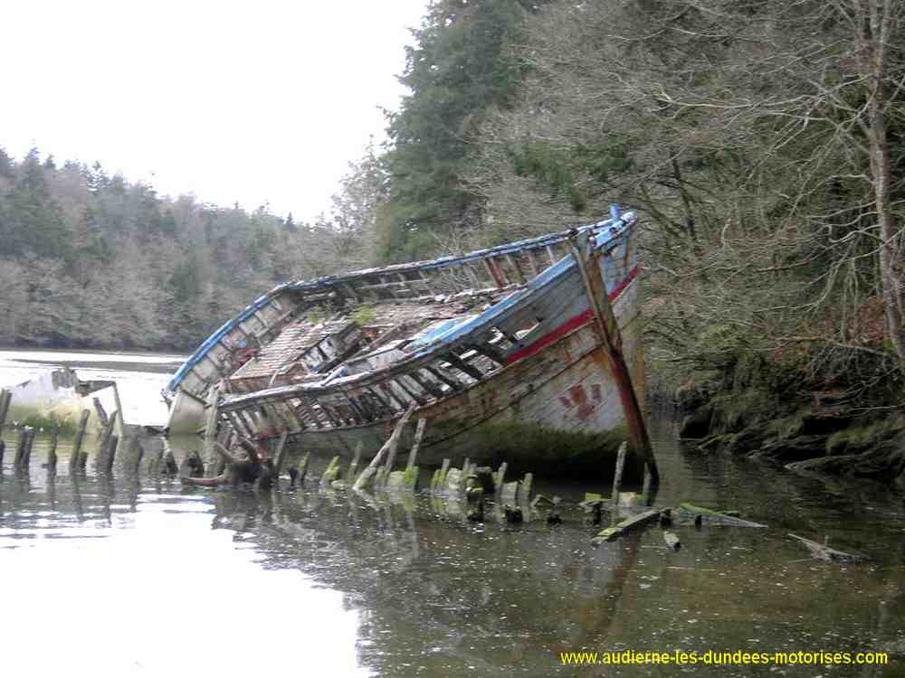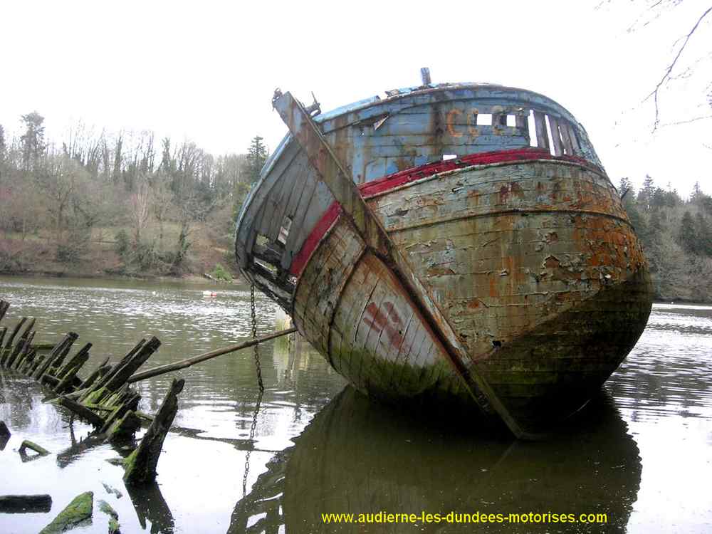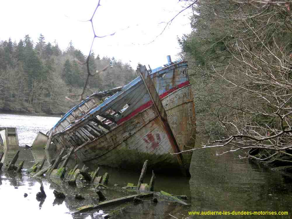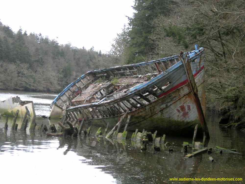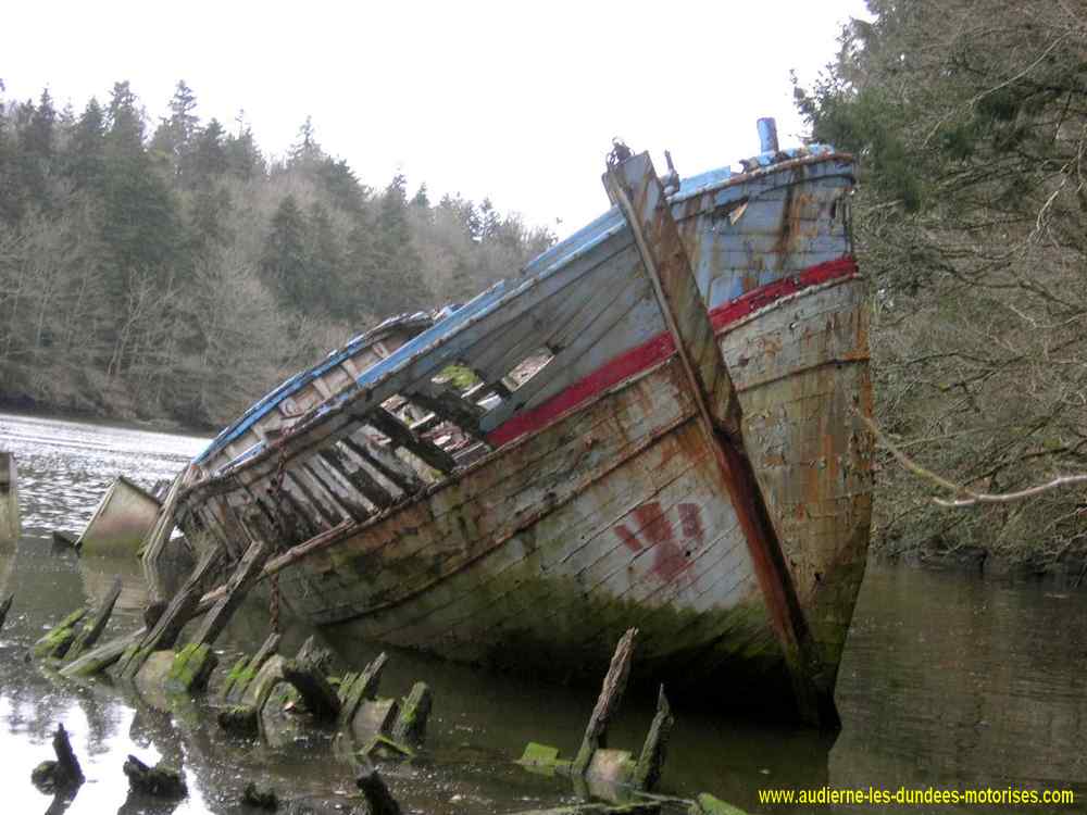 Hélas ces lieux autrefois appelés cimetières marins, vont devenir de plus en plus rares, comme l'anse de Saint Laurent qui a été débarrassée de ses vieilles carcasses au mois de juin 2012, sous couvert de sécurité et/ou d'écologie. C'est ainsi qu'une pelleteuse est venue détruire ce qui restait de la carcasse du ND de Penhors, (et non de l'An Dri Lam comme je l'avais mentionné par erreur) |