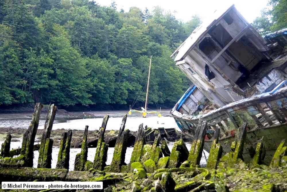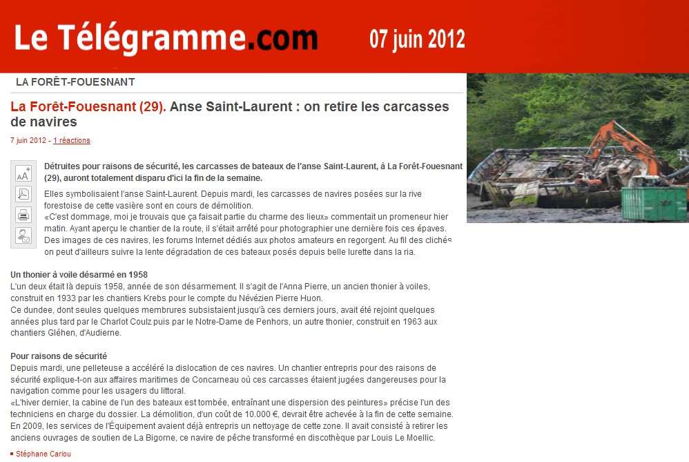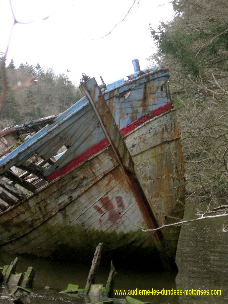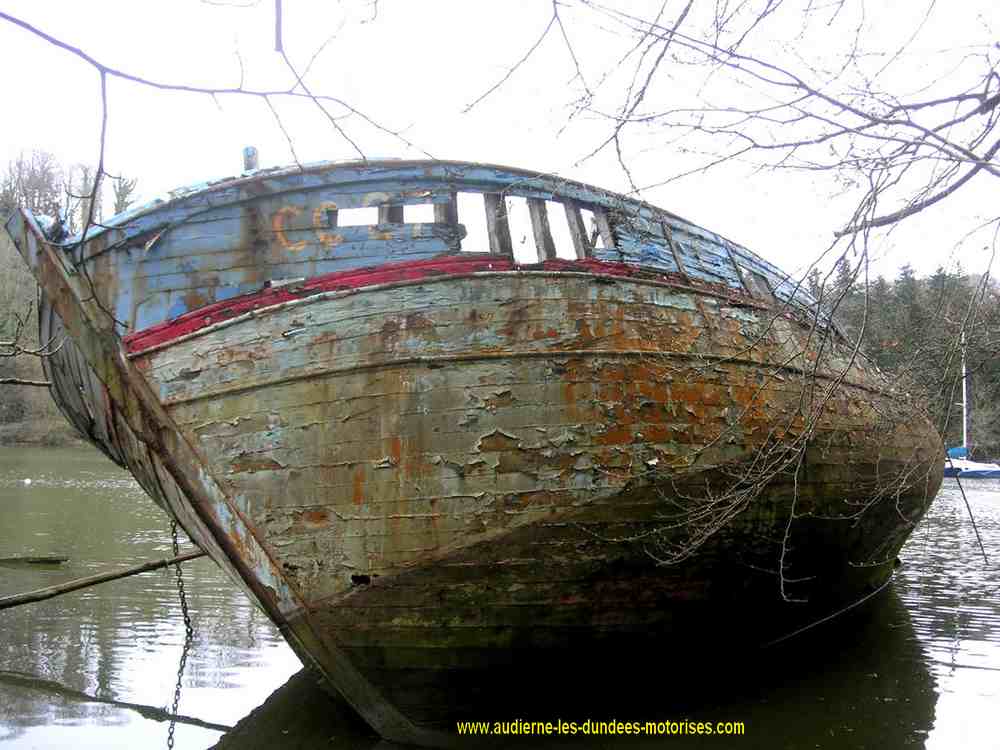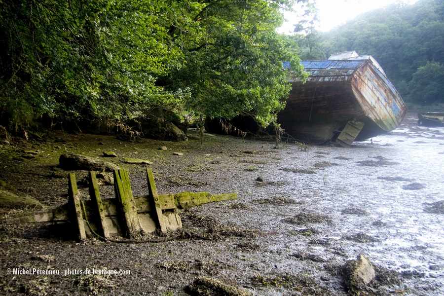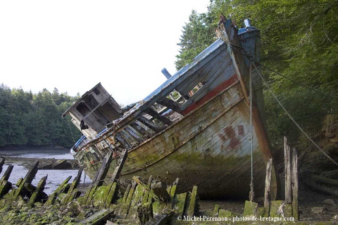 Hélas ces lieux autrefois appelés cimetières marins, vont devenir de plus en plus rares, comme l'anse de Saint Laurent qui a été débarrassée de ses vieilles carcasses au mois de juin 2012, sous couvert de sécurité et/ou d'écologie. C'est ainsi qu'une pelleteuse est venue détruire ce qui restait de la carcasse du ND de Penhors, (et non de l'An Dri Lam comme je l'avais mentionné par erreur) |