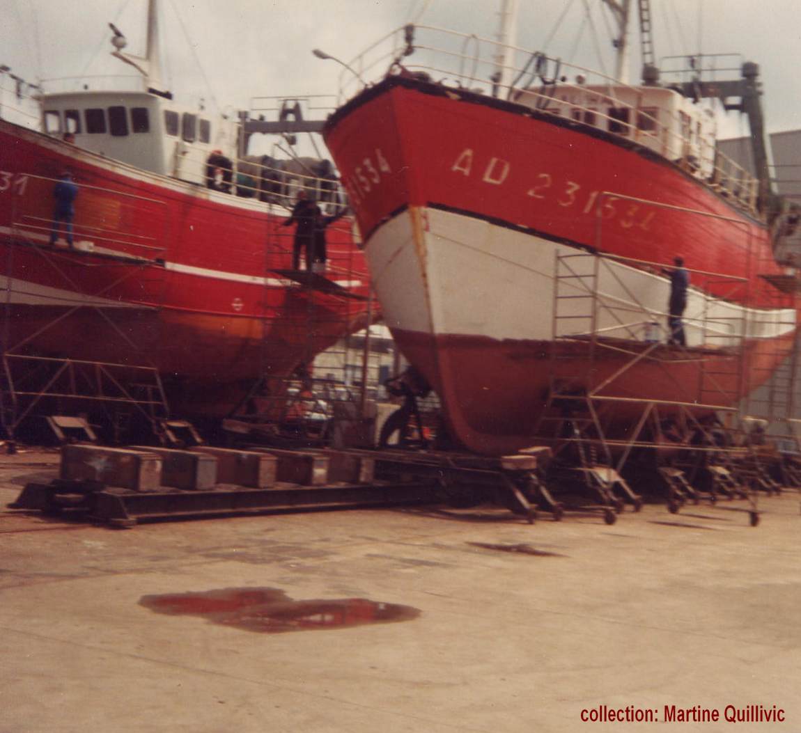 | à Audierne | sur le slipway de Douarnenez avec Arpège - Les ouvriers du chantier Quillivic sont en train d'intervenir sur les deux bateaux |