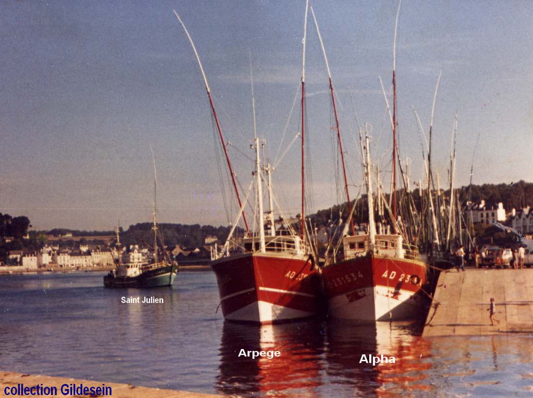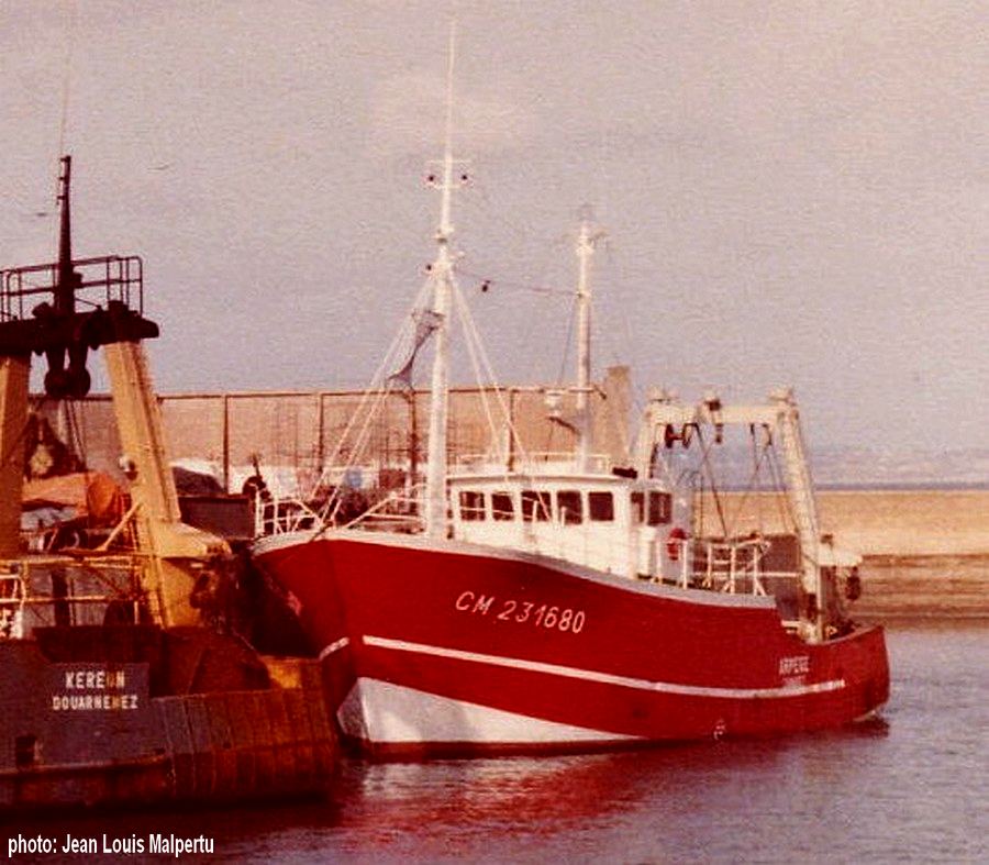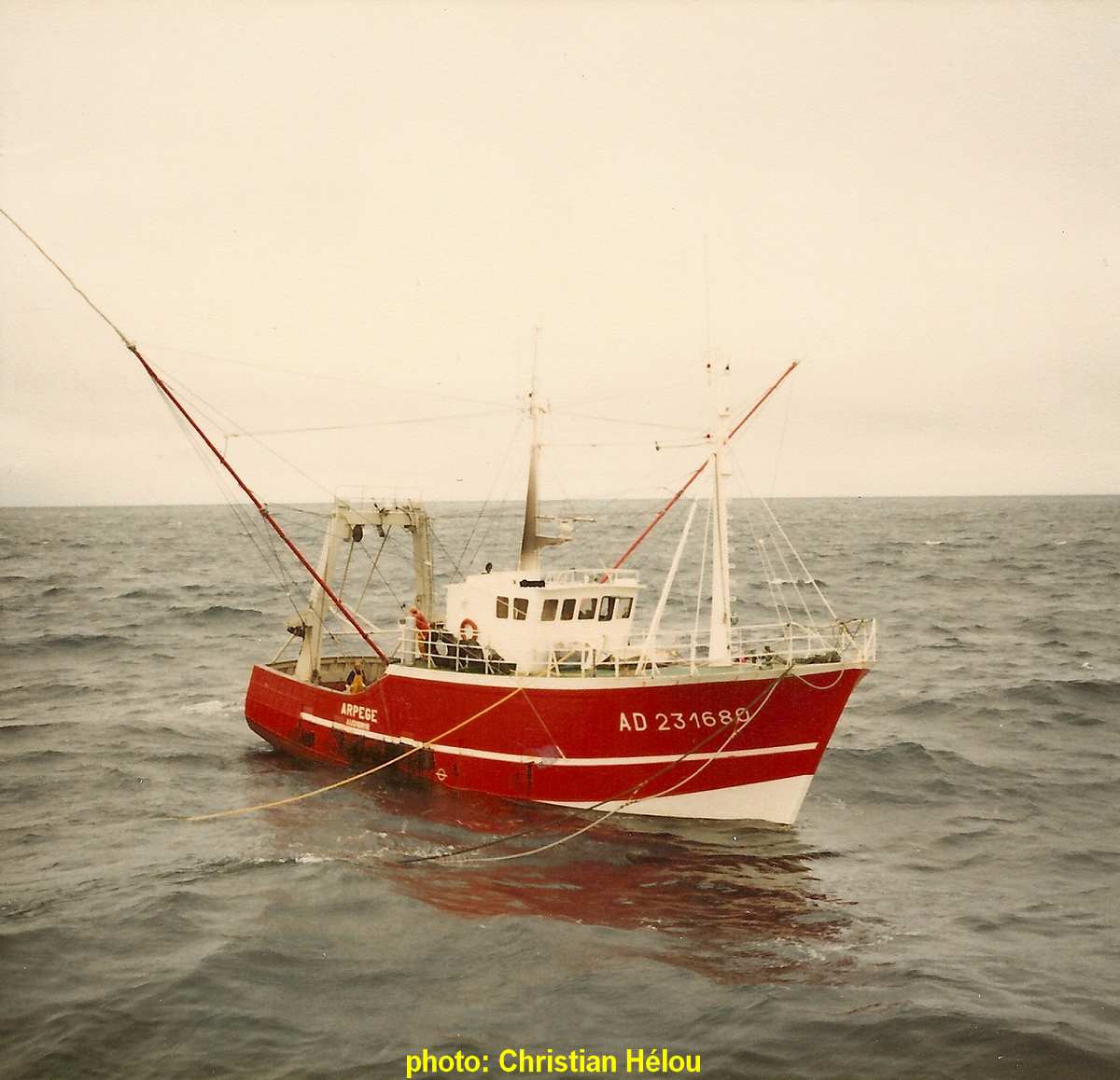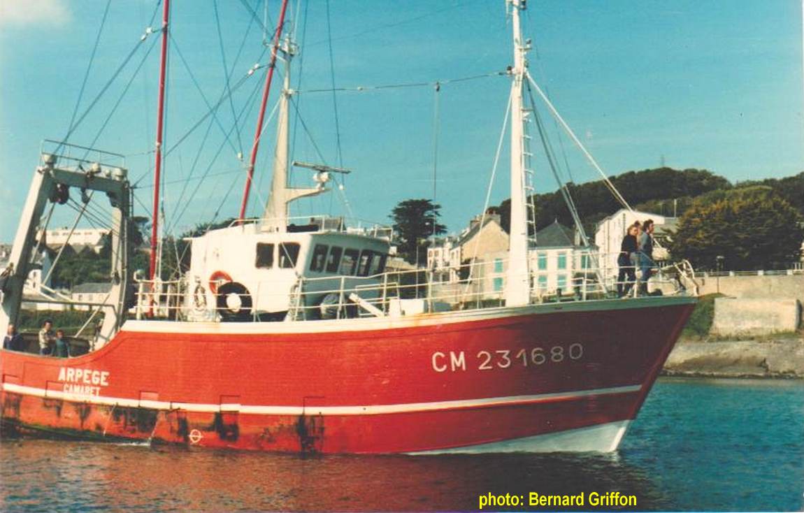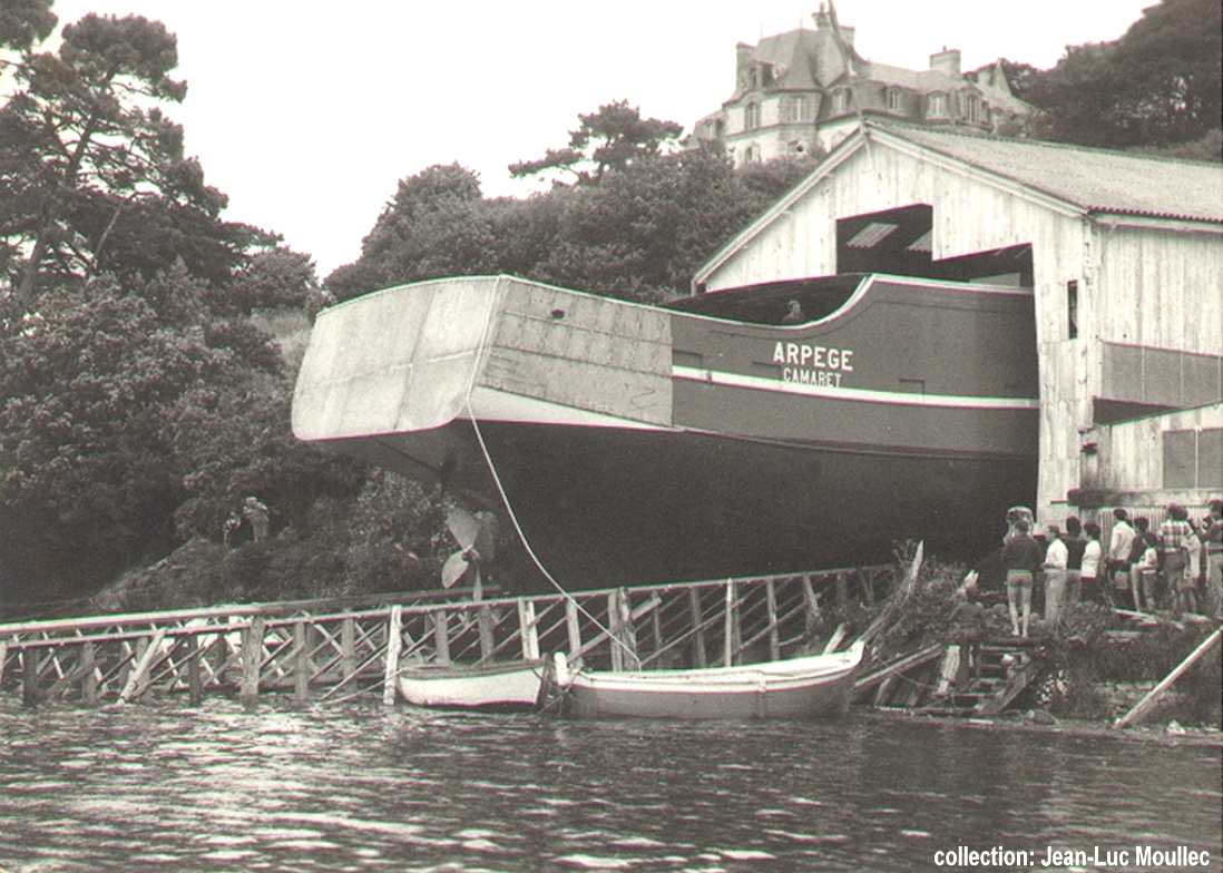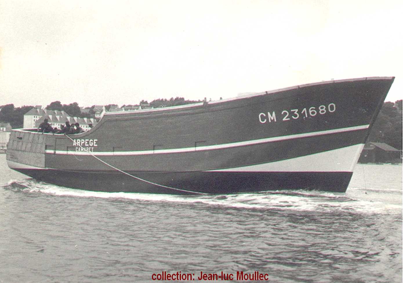 | "Arpège" à été lancé à Audierne, c'était le plus gros bateau construit par Paul Quillivic ; au moment du lancement il ne restait que quelques centimètres entre le point le plus haut du bateau et le toit du hangar du chantier, mais une fois de plus le charpentier de Locquéran et ses compagnons réussirent un coup de maître. "Arpège" avait été construit pour le compte de la SACCAM ( société d'armement coopératif camarétois ) comme ses sister ships "Alpha" et "Aurélien" construits eux chez Péron à Camaret. Les trois bateaux ont ensuite été repris ( mars 1980 pour Arpège ) par des patrons du quartier d'Audierne. |