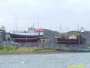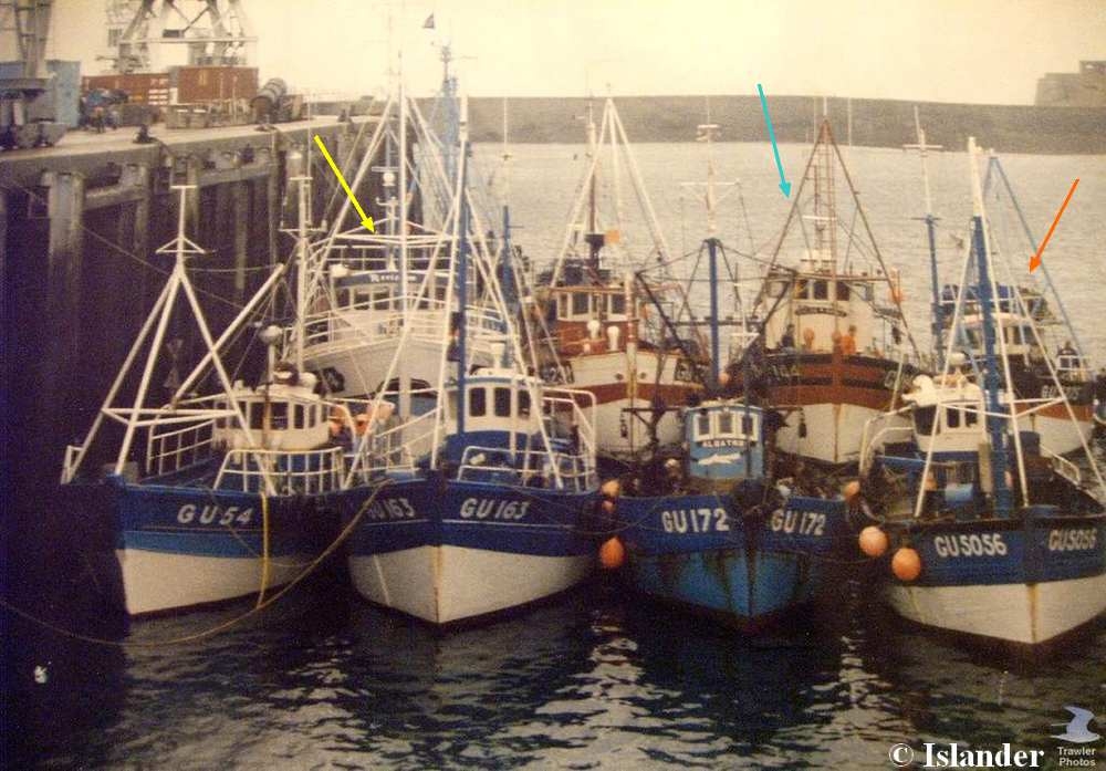 Keristum à Guernesey ( flèche jaune ) avec Kalon Breiz ( flèche bleue ) et Pearl de L'Ocean ( flèche orange ) et seul au ponton de bois dans une configuration encore assez proche de celle d'Audierne