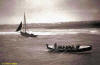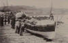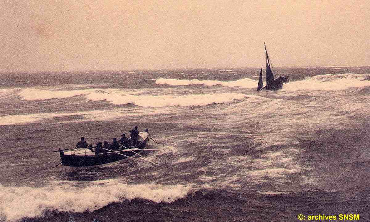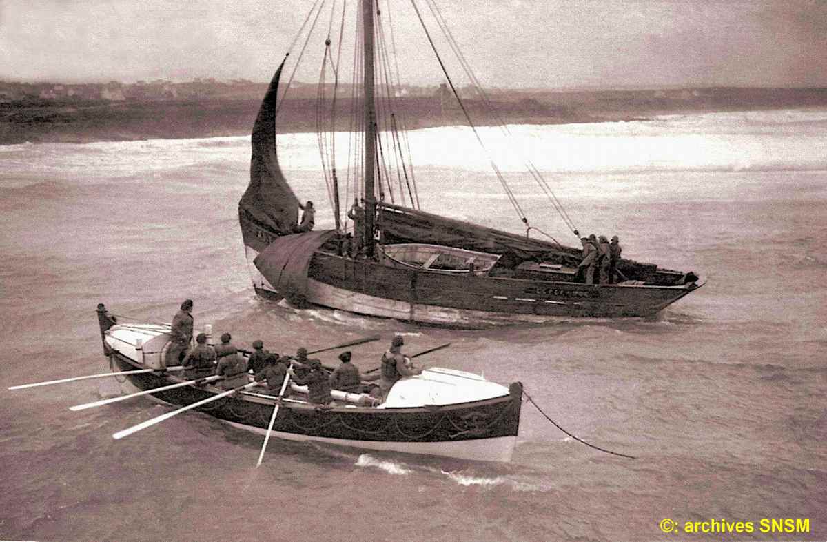 | Quand le temps était mauvais et que le franchissement de la barre devenait dangereux, le canot de sauvetage se positionnait de manière préventive sur la barre. Ici le "Général Béziat" assiste le sloop "Espérance" Au 1648 lors de sa rentrée au port, la scène se déroule en 1931, sans doute lors de la tempête de sinistre mémoire du 26 août qui endeuilla le port d'Audierne/Poulgoazec. | ||||