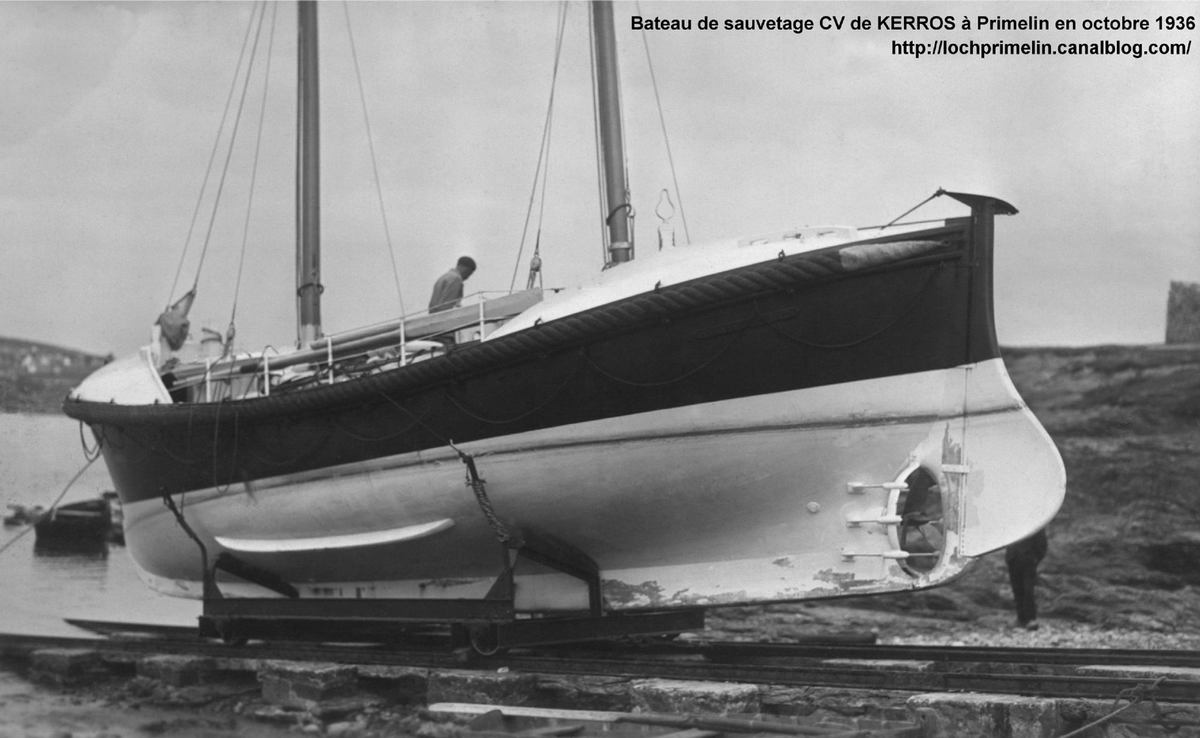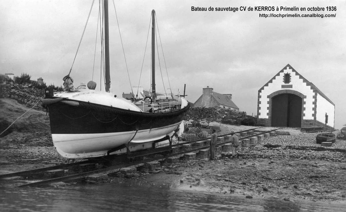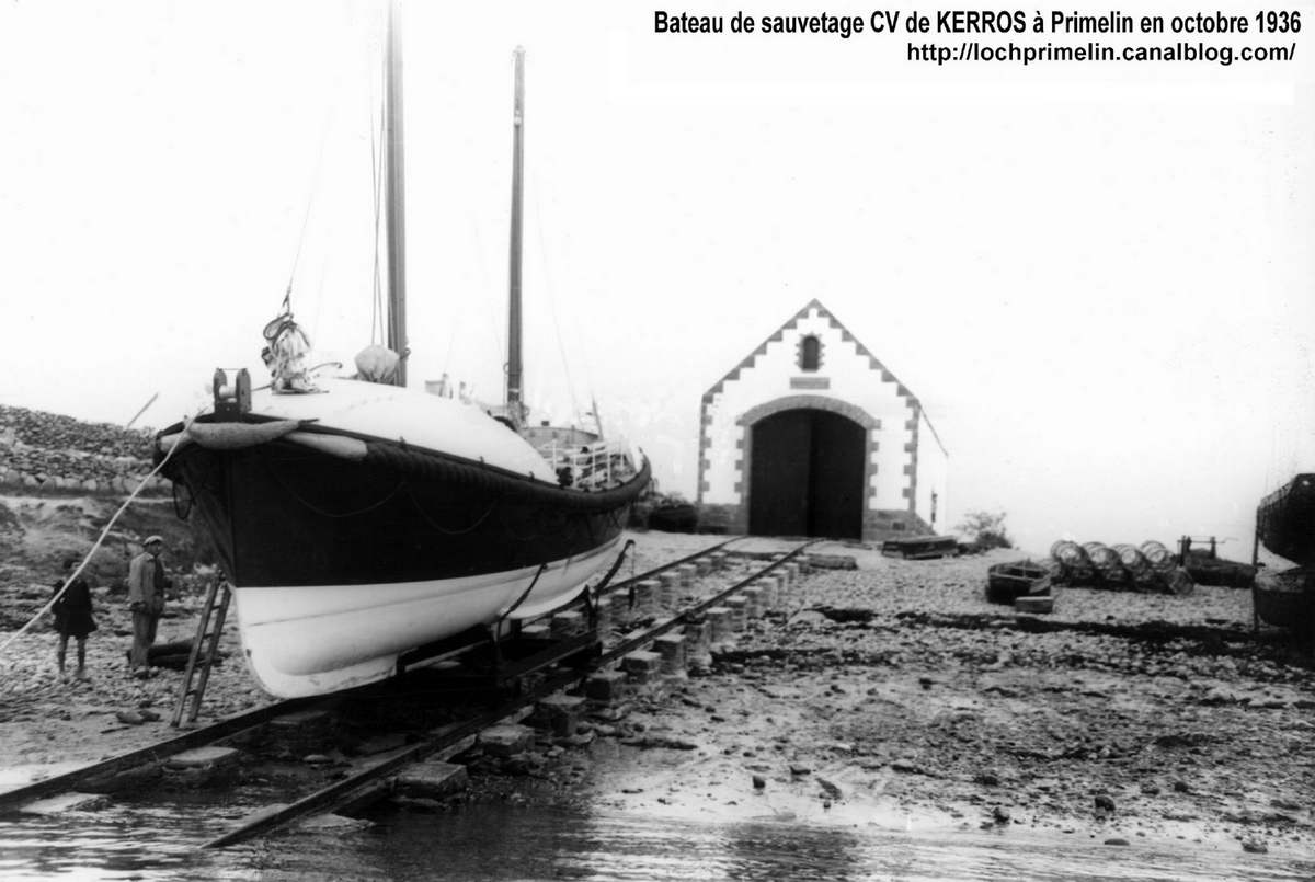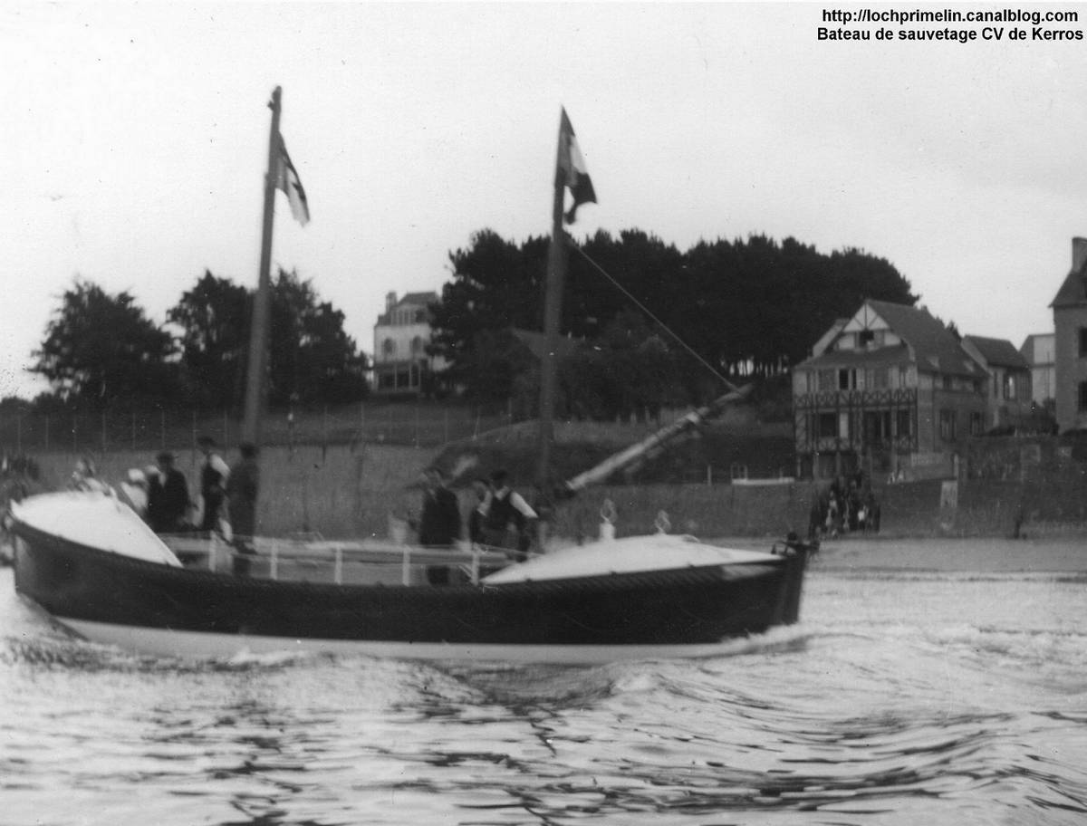 | Avant d'être admis au service actif, comme on dit dans la "Royale", le CV Kerros s'était illustré le 30 octobre 1936 en portant secours à 5 bateaux qui par suite d'un coup de vent brutal et inattendu, se trouvèrent en difficulté et dans l'impossibilité de rejoindre le port du Loch. Le canot de sauvetage pris en remorque 3 premiers bateaux ( Au1481, Au 1264 & Au 1756 ) jusqu'à Audierne, puis ressortit pour porter secours à deux autres. Il ressortit encore une troisième fois pour assister deux bateaux de Pors Poulhan qui furent également remorqués à Audierne. Rude journée mais beaucoup de vies sauvées. click pour le récit complet des sauvetages du 30 octobre |