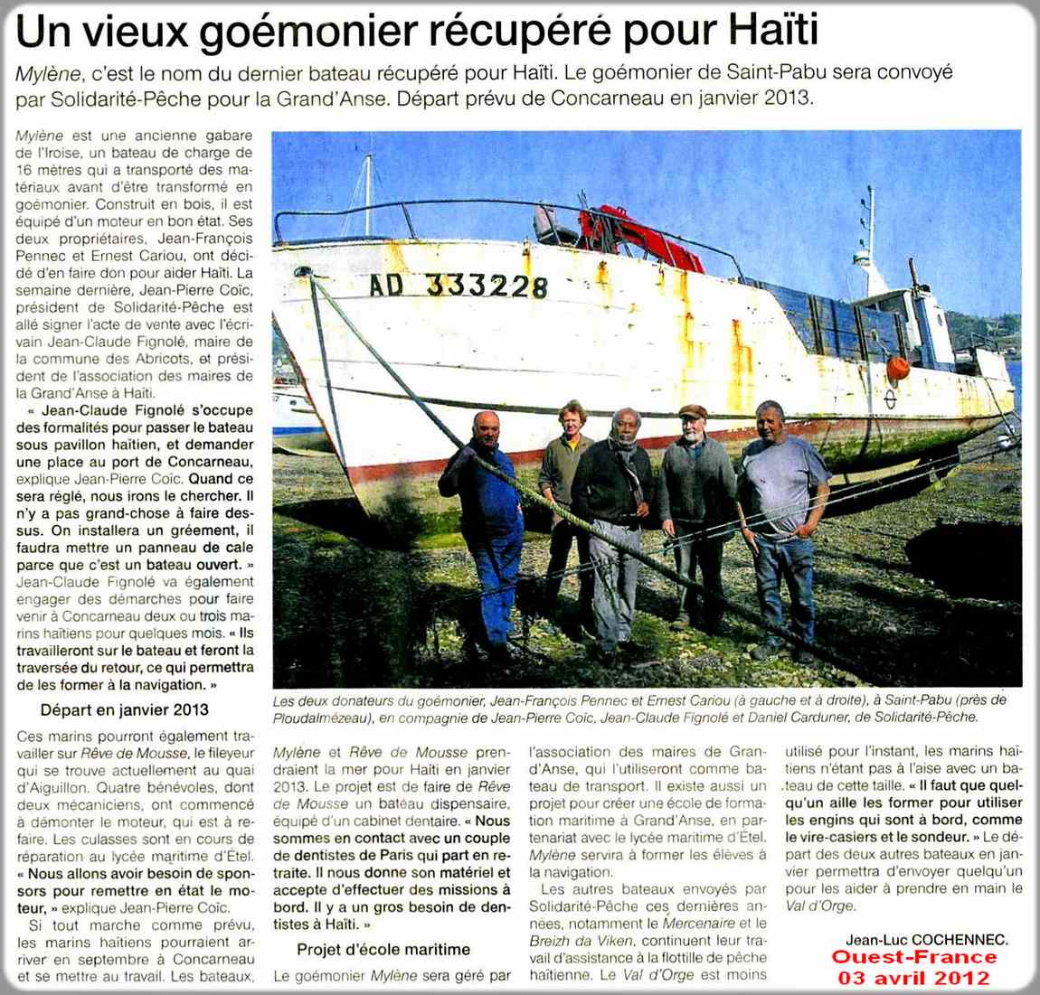 Racheté, en co-propriété par Ernest Cariou et Jean François Pennec, il est depuis quelques années sur Audierne où il rapatrie le goëmon récolté autour de l'île de Sein par les bateaux plus petits qui ne peuvent effectuer la traversée avec de tels chargements